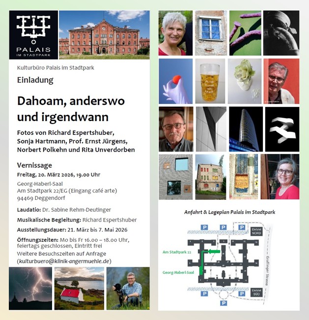 Die Vernissage zur Foto-Ausstellung findet statt am Freitag, den 20. März 2026, um 19.00 Uhr im Georg-Haberl-Saal im Palais im Stadtpark (Am Stadtpark 22/EG); im Anschluss kleiner Empfang. Die Laudatio hält Dr. Sabine Rehm-Deutinger. Die musikalische Begleitung gestaltet Richard Espertshuber.