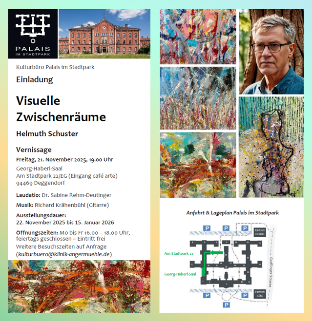 Die Vernissage zur Ausstellung findet statt am Freitag, den 21. November 2025, um 19.00 Uhr im Georg-Haberl-Saal im Palais im Stadtpark; im Anschluss kleiner Empfang.