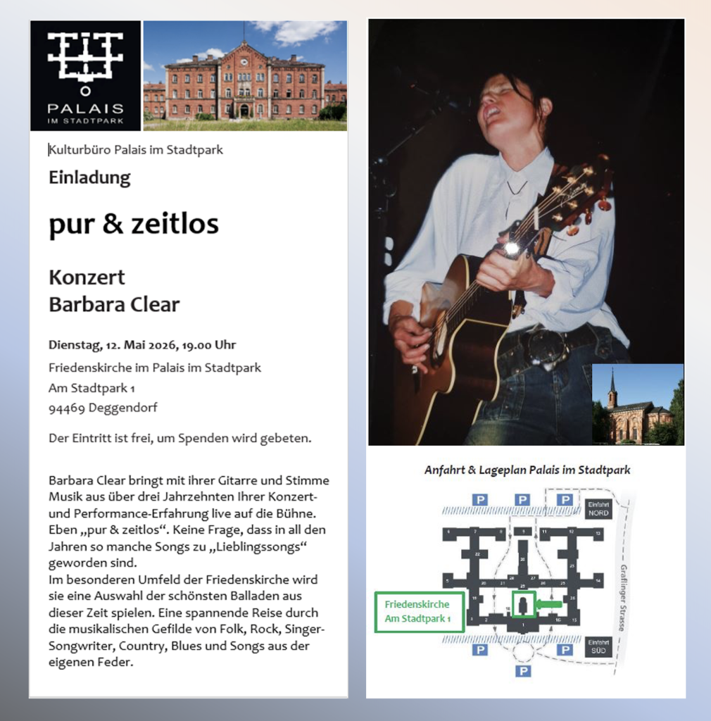 Barbara Clear bringt mit ihrem Programm „pur & zeitlos“ eine Auswahl ihrer persönlichsten Songs auf die Bühne – reduziert, unmittelbar und getragen von ihrer unverwechselbaren Stimme und Gitarrenbegleitung. Seit vielen Jahren ist sie als Singer-Songwriterin präsent und verbindet eigene Kompositionen mit ausgewählten Stücken aus Folk, Rock und verwandten Genres – geprägt von einer klaren, persönlichen Handschrift.