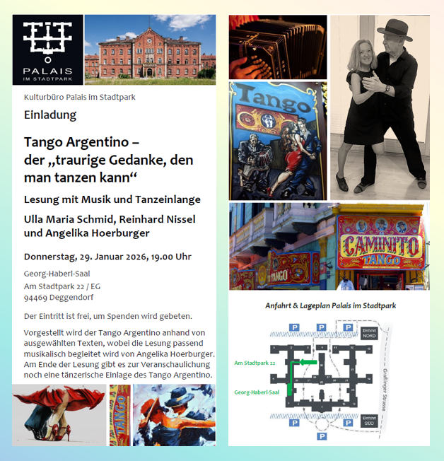 Am Donnerstag, den 29. Januar 2026, findet um 19.00 Uhr im Georg-Haberl-Saal eine Lesung über den Tango Argentino statt. Die beiden Vortragenden – Reinhard Nissel und Ulla Maria Schmid – sind selbst begeisterte Tangotänzer, Herr Nissel tanzt seit mittlerweile über 20 Jahren, Frau Schmid seit etwa 15 Monaten. Vorgestellt wird der Tango – jener „traurige Gedanke, den man tanzen kann“ – anhand von ausgewählten Texten, wobei die Lesung passend musikalisch begleitet wird von Angelika Hoerburger, ebenfalls einer enthusiastischen Tänzerin. Am Ende der Lesung gibt es zur Veranschaulichung noch eine tänzerische Einlage des Tango Argentino.